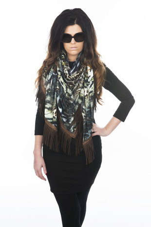 INDYJANE Scarf Marquez L is een zachte Boho scarf in fascinerende groen- zwart print met dark brown  fringes.
